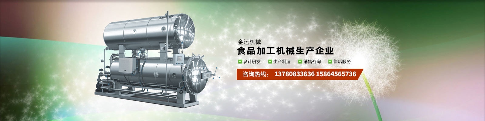 主要產(chǎn)品有:行星攪拌夾層鍋、夾層鍋、壓力煮鍋、各種餡料炒鍋、殺菌鍋(殺菌釜)、巴氏殺菌機(jī)、清洗流水線(xiàn)、風(fēng)干線(xiàn)、真空包裝機(jī)、滾揉機(jī)、斬拌機(jī)、鹽水注射機(jī)、大蒜脫皮機(jī)、大蒜分瓣機(jī)等,廣泛應(yīng)用于各種食品加工、食品殺菌及農(nóng)產(chǎn)品深加工、化工、醫(yī)藥的生產(chǎn)等??蓾M(mǎn)足外資企業(yè)、合資企業(yè)及國(guó)內(nèi)大中小企業(yè)生產(chǎn)需求,產(chǎn)品暢銷(xiāo)全國(guó)各地。